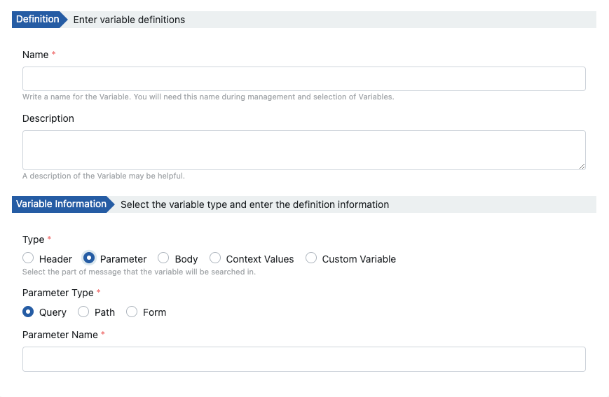 Parametre Tipi (Param Type) | Parametrenin istemciden (client) gelen istek tipinin seçildiği alandır. Varsayılan değeri QUERY'dir. Form parametre değeri olarak okunabilecek değerler; x-www-form değerleri ve attached text data part değerleridir. x-www-form değerlerinde ekleme, silme, düzenleme yapılabilir, text data part kısmı sadece okunabilirdir (read-only), ekleme/düzenleme yapılamaz. Okuma işlemi her yerden yapılabilir. Değerleri ekleme/silme/düzenleme ise sadece istek (request) hattı için geçerlidir. |