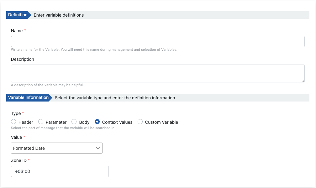 Zone ID | Değer olarak Date/Time grubundaki değerlerden herhangi biri seçilmişse bu alan aktifleşir. Örnek değer: "+03:00" veya "Europe/Istanbul". Daha fazlası için burayı ziyaret edebilirsiniz. |