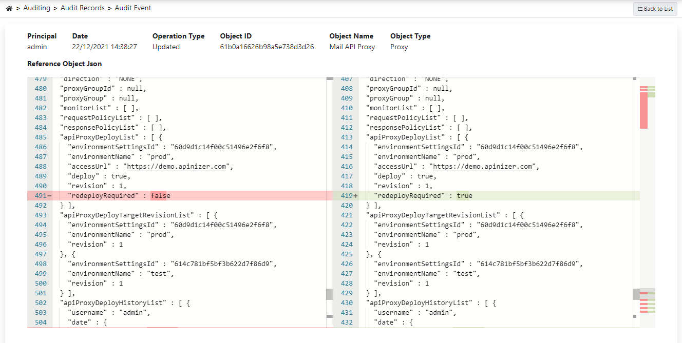 "Değişiklik Detayı" ekranı verilerin sağındaki göz simgeli detay butonuna tıklanarak görüntülenir. Sayfa sağladığı diff editor aracılığıyla kullanıcının sistem üzerindeki yapılan değişikleri eski versiyon ve yeni versiyon şeklinde sırasıyla görmesine olanak sağlar.