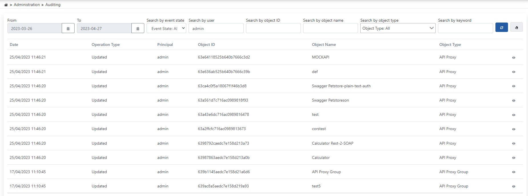Denetim Kayıtları kullanıcıların sistem üzerinde yapılan değişiklikleri görmelerine olanak sağlar. Gerçekleştirilen işlemler tarih, operasyon tipi, kullanıcı, nesne id, nesne adı ve denetim objesinin tipi parametreleriyle loglanır. Sayfanın üst tarafında filtre bölümünden kullanıcılar kriterler belirleyerek sonucları log tablosunda görüntüleyebilirler. Silme butonu ile filtre içerikleri temizlenir.