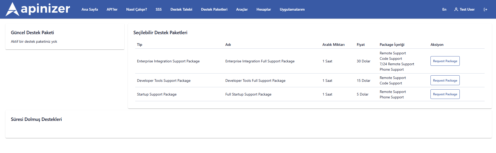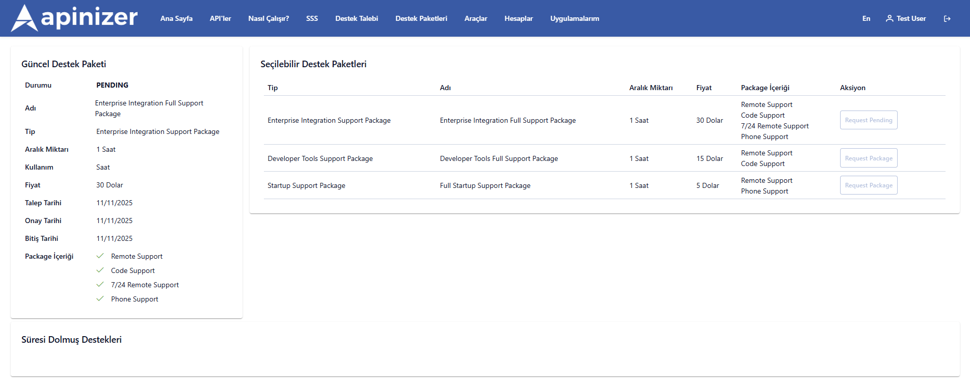 | 4 | Destek paketi isteği oluşturur | Seçilen paket için “Request Support Package” butonuna tıklar ve isteği gönderir. |