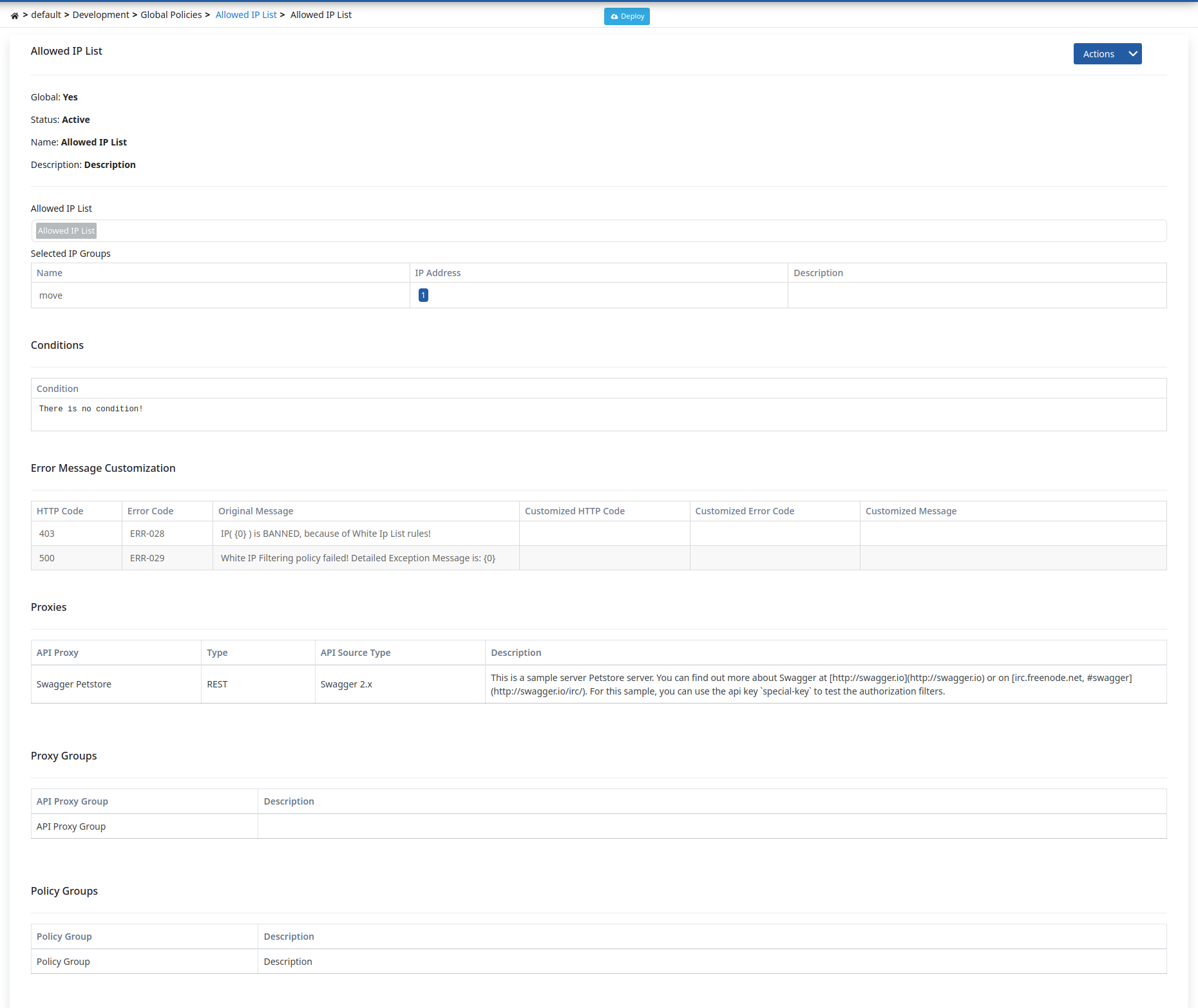 Global politika üzerinde herhangi bir değişiklik yapıldığında, bu politikayı kullanan API Proxy'lerin ve API Proxy Grupların durumu "Redeploy Required" olarak değişir. Bunları tek tek deploy etmek yerine, bu sayfadaki deploy özelliği ile bu politikayı kullanan tüm API Proxy'lerin ve API Proxy Grupların belirli bir çalışma ortamına (environment) toplu olarak deploy edilmesini sağlanır.