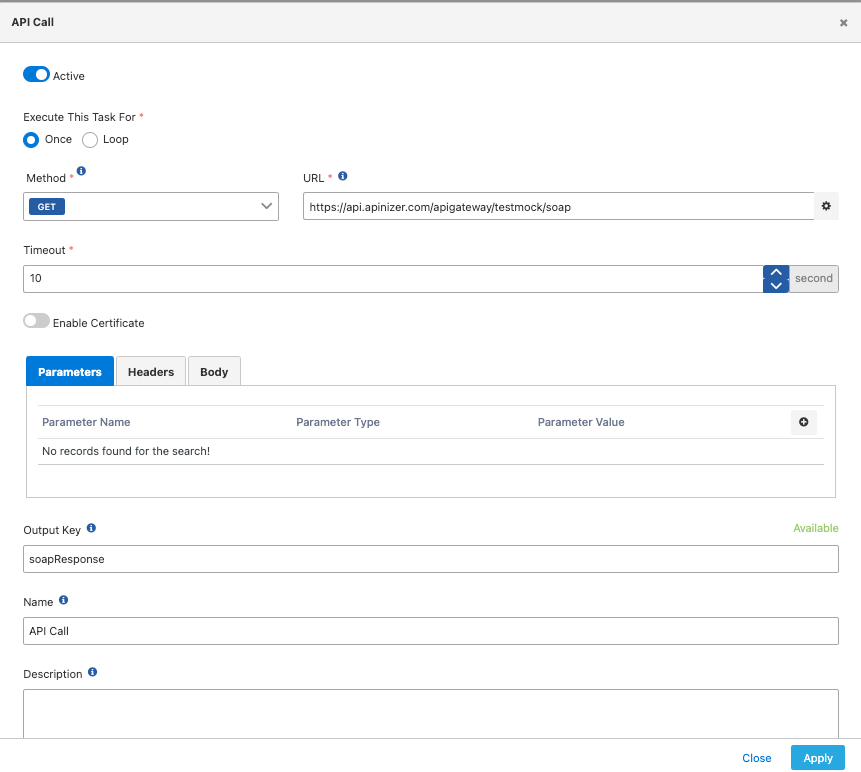 - Bir sonraki görevde web servisden dönen veriyi kullanabilmek için output anahtar bilgisine "soapResponse" değeri verilir. (Bu değer adını istediğiniz şekilde isimlendirebilirsiniz.)