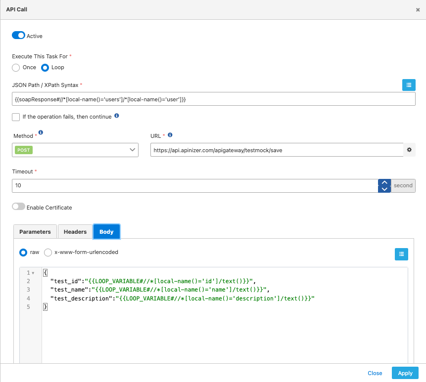 - Önceki görevden gelen dizi verisi üzerinde döngü ile çalışılacağını belirtmek için "Loop" seçeneği seçilir.