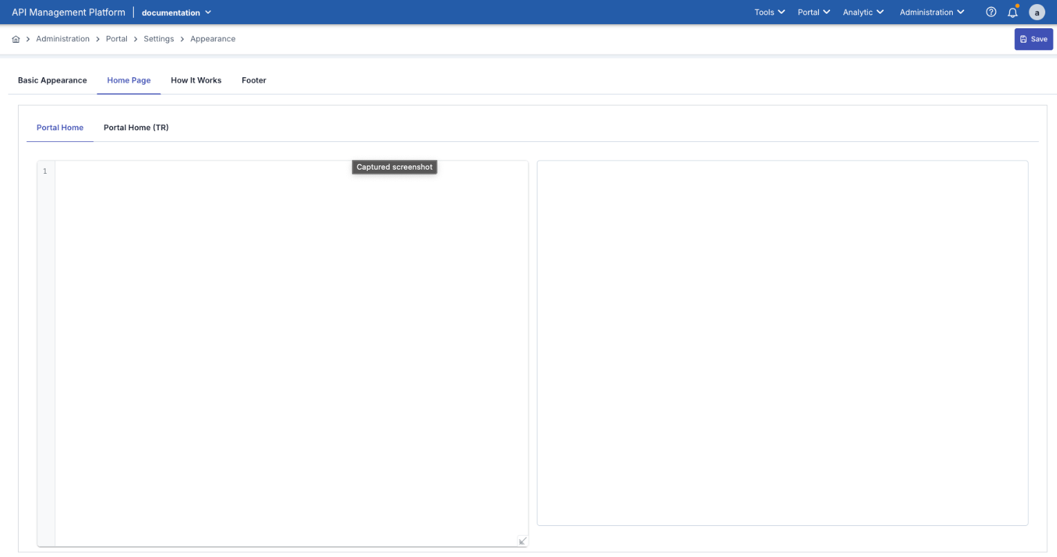 Bu alan, API Portalı ana sayfasında kullanıcıların ilk karşıladığı içeriklerin düzenlendiği bölümdür. Portalın tanıtım metinleri, yönlendirici açıklamalar, bağlantılar veya görsel içerikler bu sekmede tanımlanır.