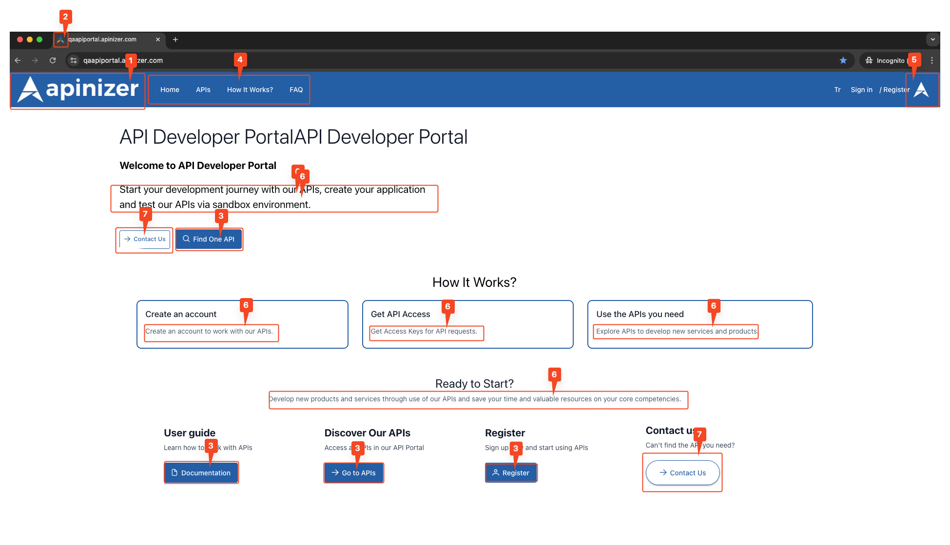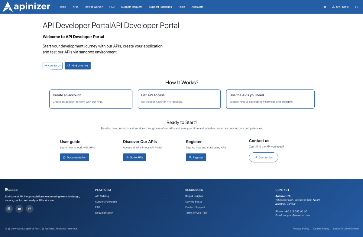 Varsayılan içerik girildiğinde portal ana sayfası, kullanıcıya karşılama başlığı, kısa açıklama ve “How It Works?”, “Discover Our APIs”, “Register”, “Contact Us” gibi aksiyon kartlarıyla açılır. Ekteki ekran görüntüsünde (örnek) ana sayfa kartlarının nasıl hizalandığı görülmektedir.