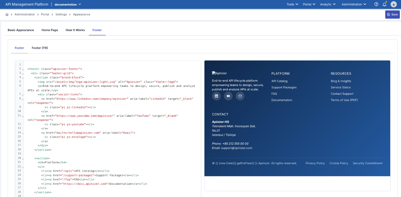 Footer HTML alanı portal alt bölümünde görünen HTML’dir.