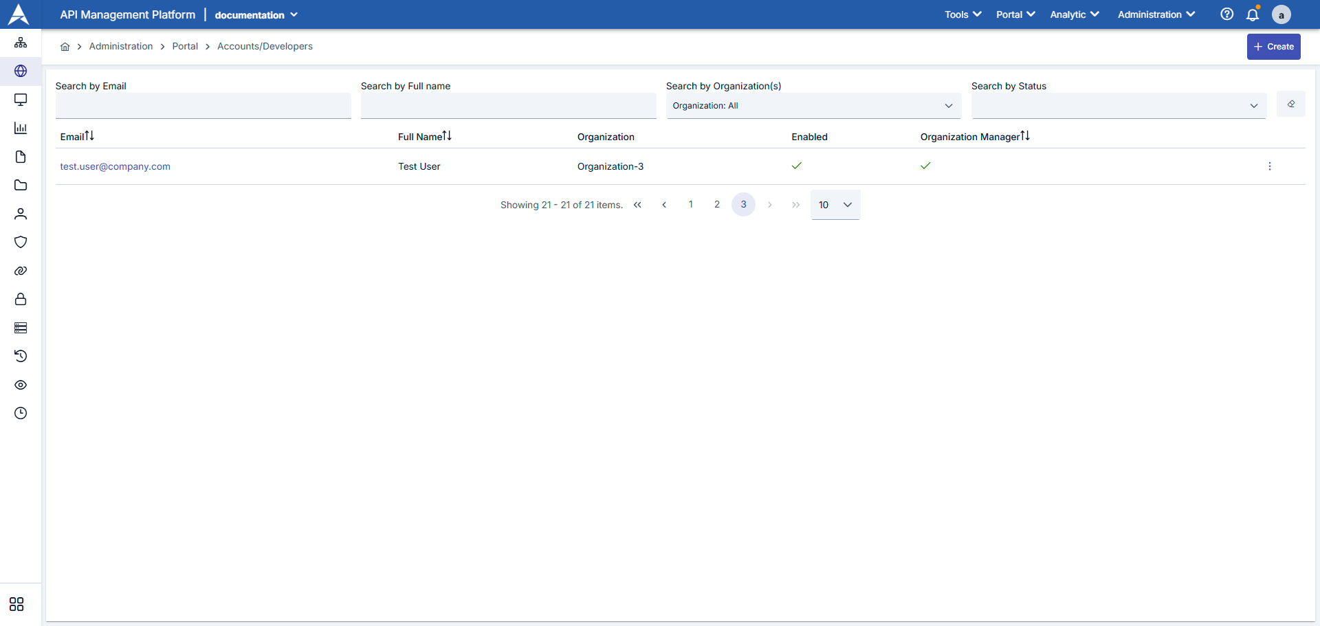 Administration > Portal > Accounts/Developers sayfası, portal üzerinde kayıtlı kullanıcı ve geliştirici hesaplarının görüntülendiği ve yönetildiği bölümdür.