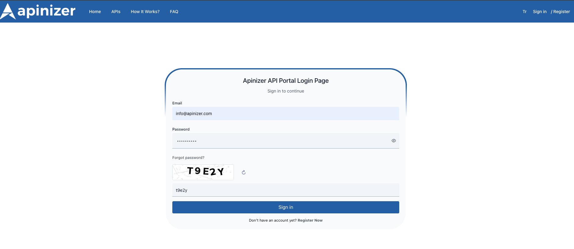 Tüm geliştiricilerin Apinizer API Portalı aracılığıyla kaydolması gerekir. Bir Apinizer yöneticisi size doğru kayıt URL'sini sağlayabilir.