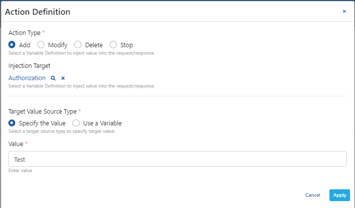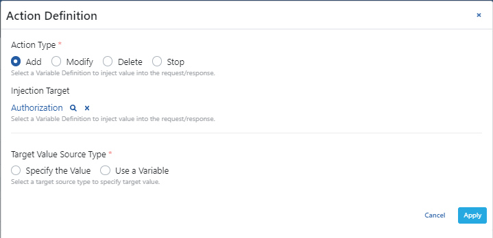 Enjeksiyon hedefi değişkeni seçildiğinde eklenen alanın değerinin nereden alınması gerektiği girilmelidir, bunun için hedef değerin kaynak tipi belirlenir: