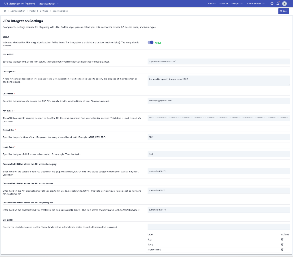 JIRA ile API Portal arasında bağlantı ayarları bu ekrandan yönetilir. Bu sayfa üzerinden JIRA bağlantı bilgilerinizi, API erişim anahtarınızı ve talep türlerinizi tanımlayabilirsiniz.