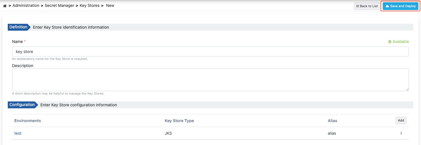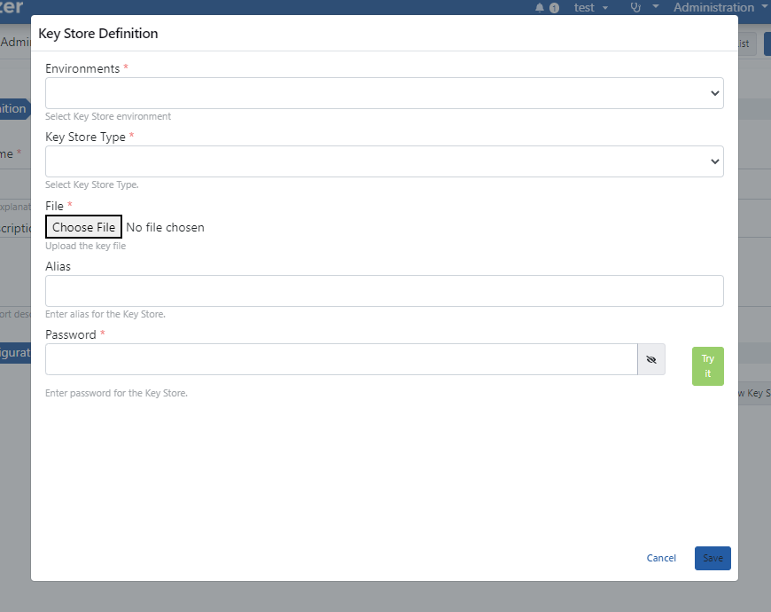 Key Store, politikalarda kullanılan key store'ların tanımlanmasını ve yönetilmesini sağlar. Key Store ekleme, silme, güncelleme işlemleri burada yalnızca Admin kullanıcısı tarafından gerçekleştirilir.