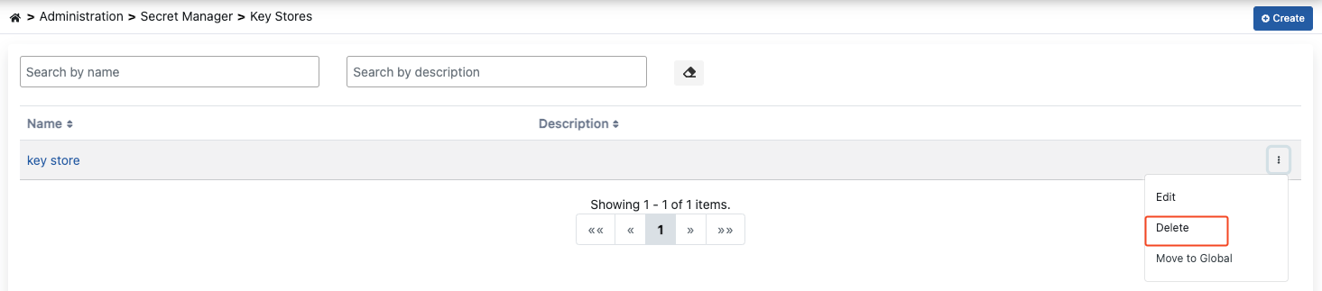 1) Varolan bir Key Store'u silmek için o Key Store'un menüsünden Sil (Delete) butonuna tıklayınız.
