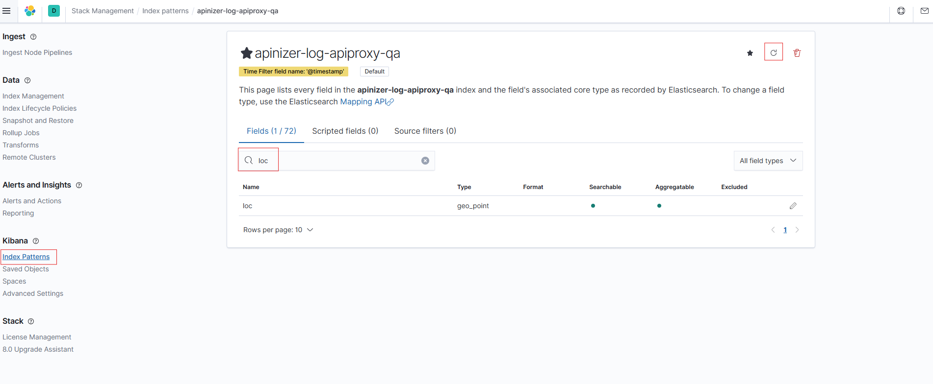 Kibana daha önce kurulduysa ve index pattern mevcutsa aşağıdaki Stack Management →Index Patterns sayfasıdan Kibanaya eklediğiniz indeksi yenileyin. Arama kısmına 'loc' yazarak ilgili değerin var olduğunu kontrol etmelisiniz.