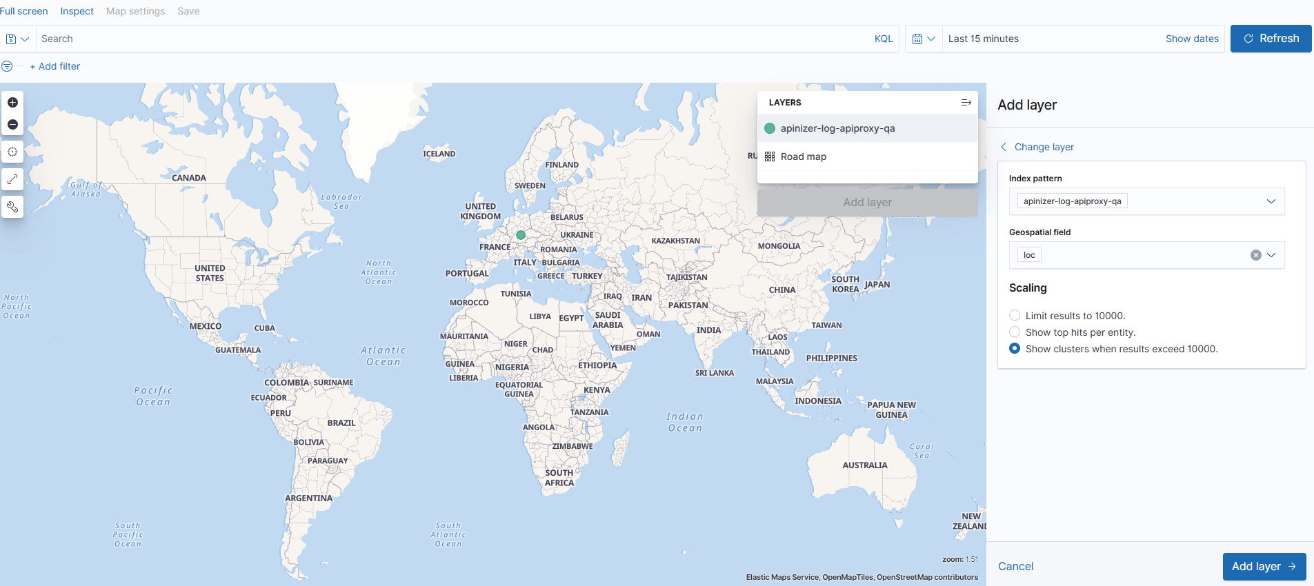 Index pattern'ı seçtikten sonra, 'loc' alanı otomatik seçilecek. Ardından, 'Add layer' butonuna tıklayıp katmanı ekleyip isim vererek kaydedebilirsiniz: