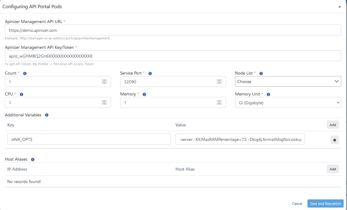 Host Takma Adlar (Host Aliases) | Ağda bulunan IP adresleri bazen host isimleri arkasına konulabilir, bunlar eğer nameserver ya da host dosyasına tanımlanmamışsa ya da bir şekilde Apinizer'ın bunları çözmesi sağlanamamışsa, worker podların bu isimleri çözmesi için Host Alias tanımı yapılmalıdır. |