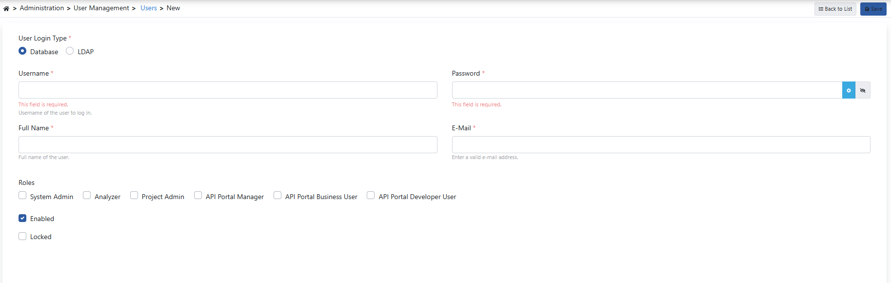 Kullanıcı Giriş Tipi (User Login Type) | Kullanıcının giriş yapacağı kaynağın seçimidir. Değeri "Veri tabanı" olması durumunda tüm bilgilerin Apinizer kullanıcı havuzunda tanımlı olacağını ifade eder. Değeri "LDAP" olması durumunda "kullanıcı adı ve parola" bilgisinin, login esnasında seçili LDAP bağlantısı üzerinden doğrulanacağını, diğer bilgilerin veri tabanında tutulacağını ifade eder. LDAP tipindeki kullanıcıların kısmi olarak da olsa Apinizer veri tabanında da tutuluyor olması kullanıcıya rol tanımlama ve projeye erişim yetkisi verilebilmesi için gereklidir. Bu durumda olan kullanıcıların LDAP havuzundaki kullanıcı adıyla bu listeye kayıt edilmesi gereklidir. LDAP ile giriş ayarlarının nasıl aktifleştirildiği hakkında detaylı bilgi için buraya tıklayınız. |