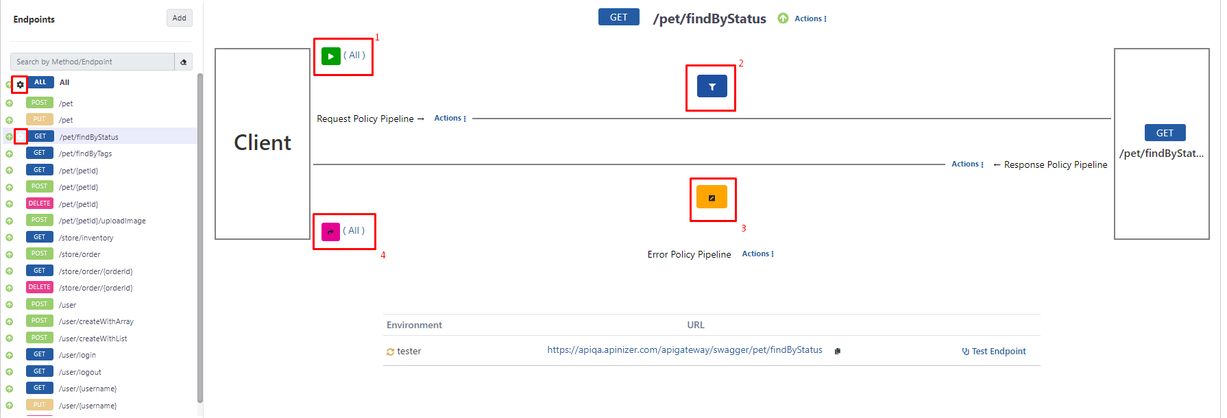 - 3 numaralı çerçeve ile işaretlenen alanda, seçilmiş olan metot/endpoint için geçerli olacak şekilde ve yanıt mesajlarına uygulanacak olan politikalar görülür.