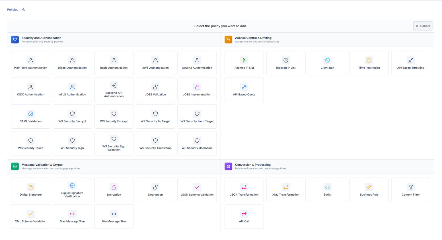 - Açılan pencereden eklenmek istenen politikanın tipi seçilir. Bu pencerede görünen politika tipleri, aktif API Proxy'nin tipine ve hangi bölge politika eklenmek istendiğine göre değişir.