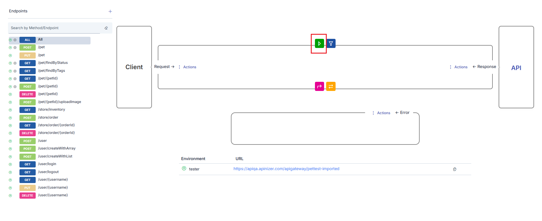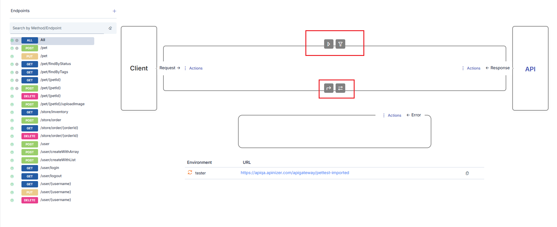 Eğer API Proxy'nin belirli bir metot/endpoint'i seçilmezse (ya da Hepsi (All)) seçilirse, aşağıdaki görselde gösterildiği gibi 2 bölge görünür.