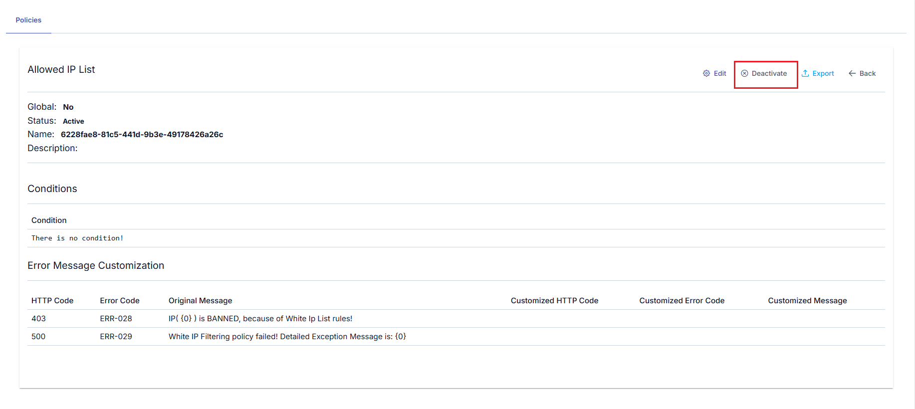 Bir politika, eklenmiş olduğu metot/endpoint ya da API Proxy'den silinmeden geçici olarak kullanımdan kaldırılabilir. Bunun için politika güncellenmek üzere açılır ve açılan pencerenin en üst kısmındaki Deactivate tuşuna tıklanır.