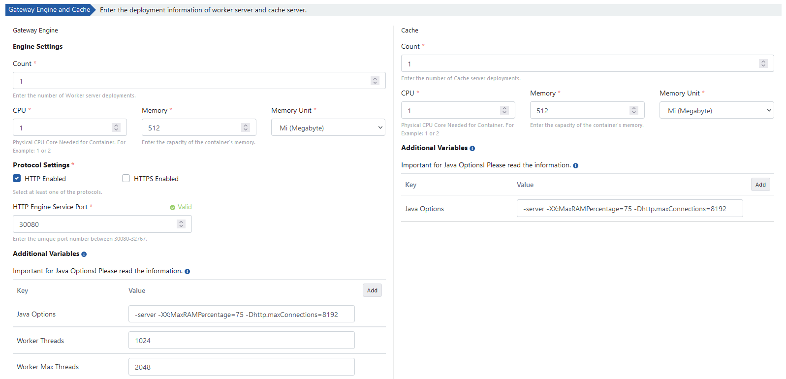 Aşağıdaki değerler sunucuların varsayılan değerleridir. Cluster kaynaklarınıza uygun olarak değiştirebilir.