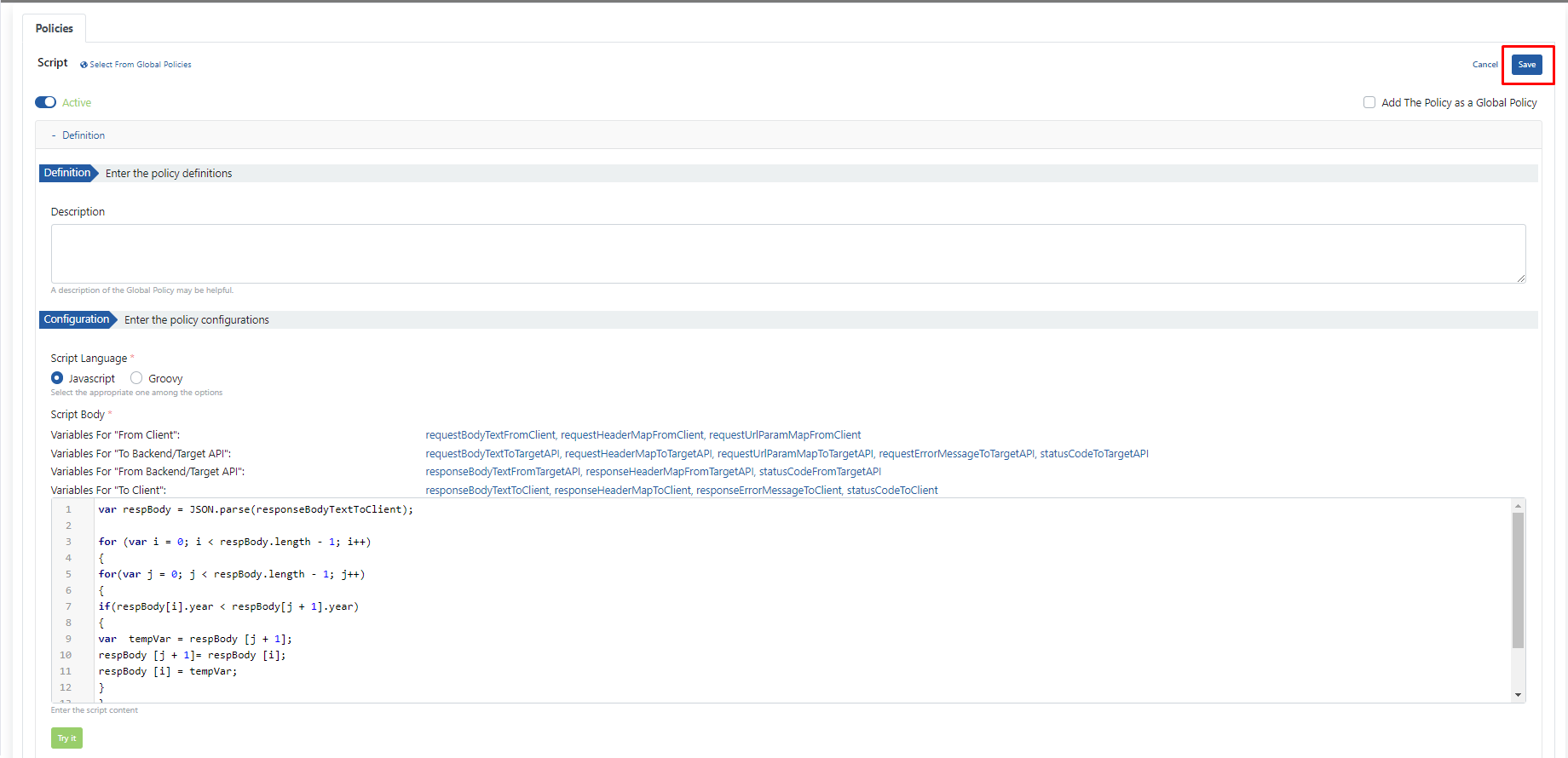 - Kullanılacak olan script yazıldıktan sonra ise Save butonuna tıklanır ve poliçe kaydedilir.