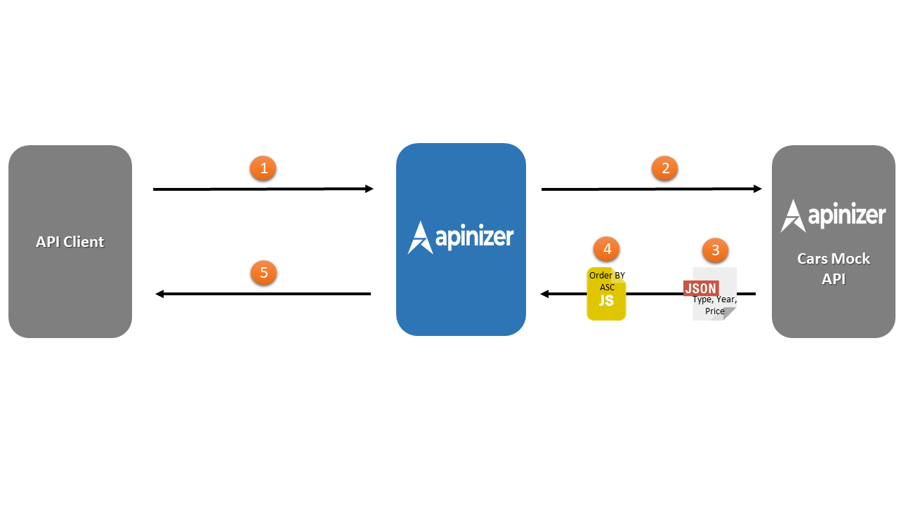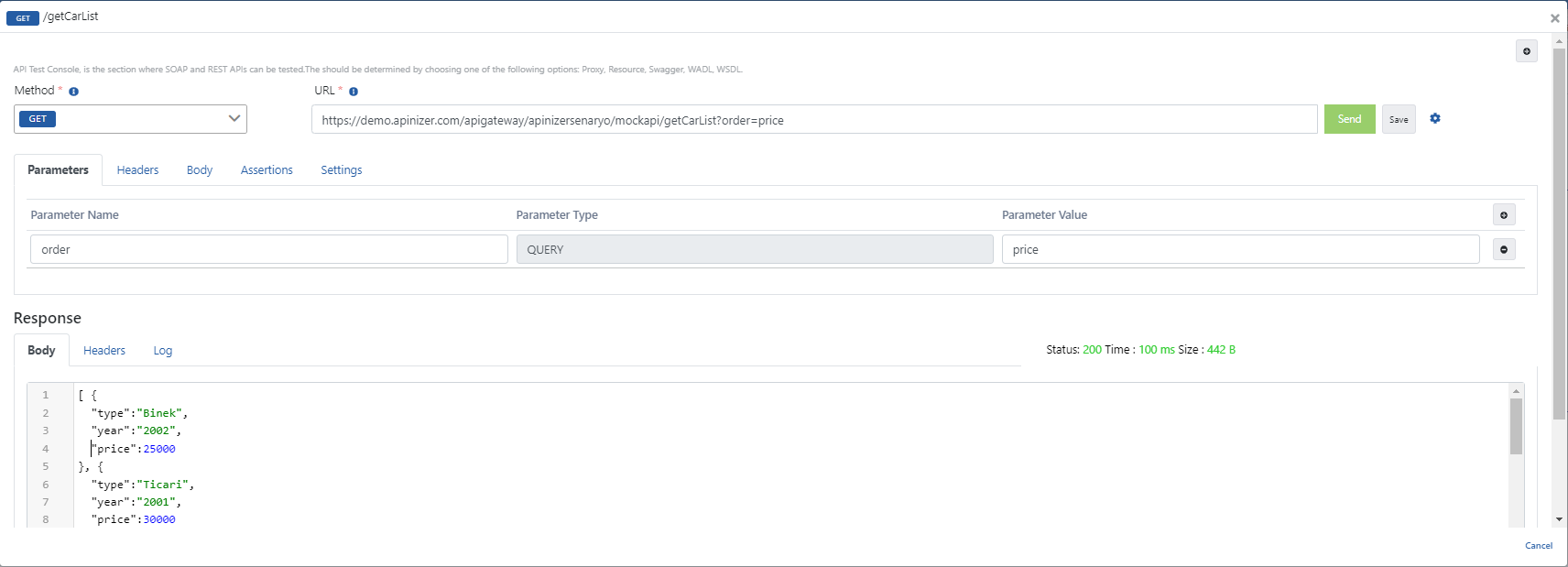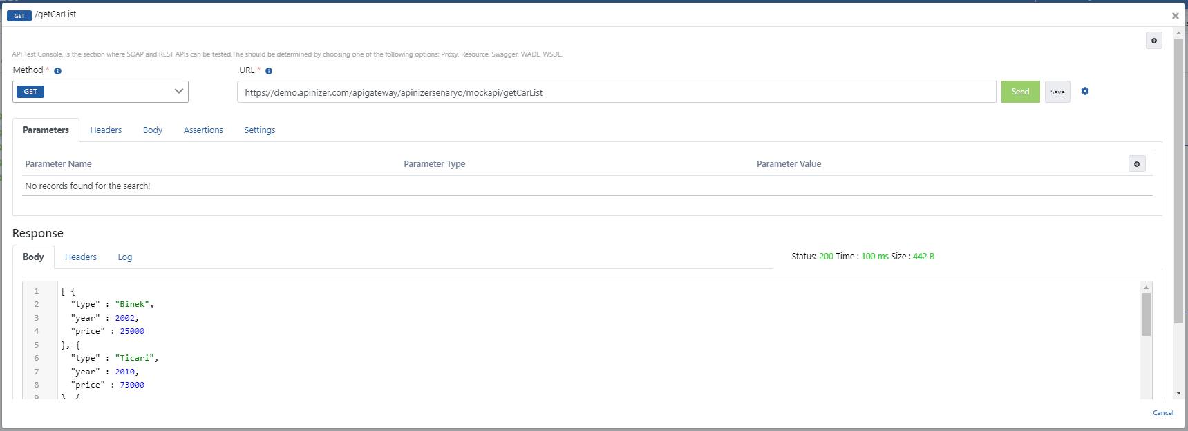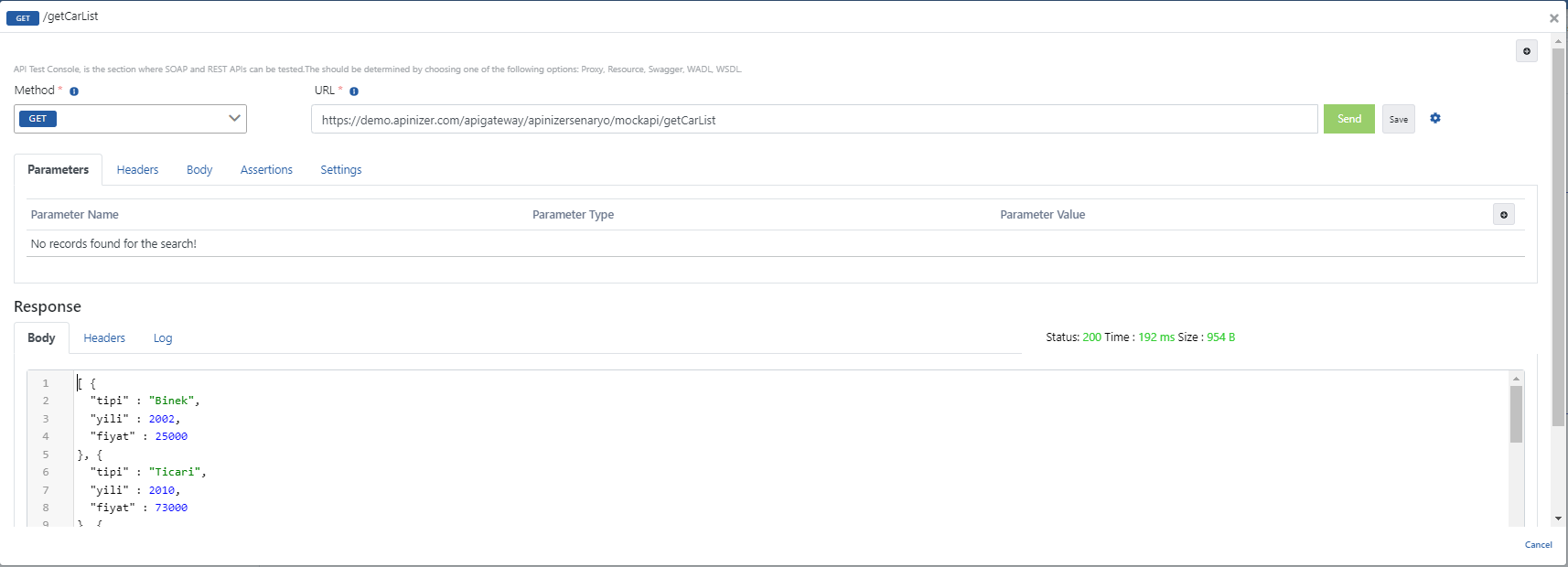 - Cars Mock API'den dönen yanıt içerisinde yer alan tip, yıl, fiyat key'leri JSON Transformation poliçesi uygulanarak type, year, price key ifadelerine dönüştürülür ve Apinizer'a iletilir.