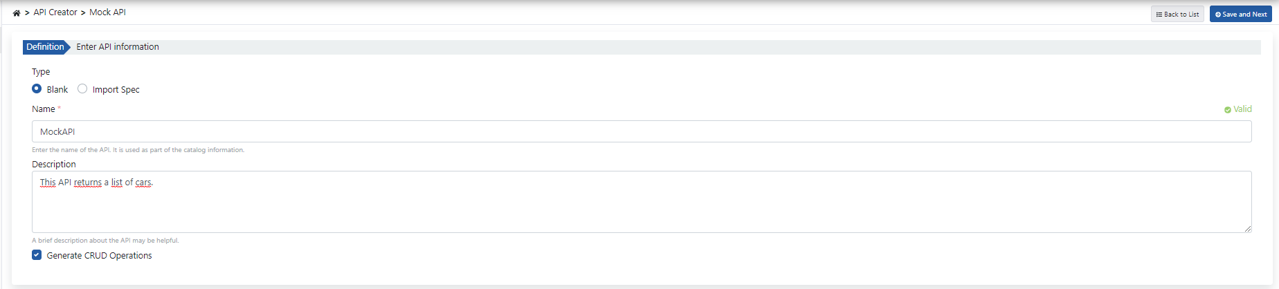 Bu senaryoda boş bir Mock API oluşturulacaktır bu yüzden "Blank" ifadesi seçilir ve ilgili alanlar görseldeki gibi doldurulur.