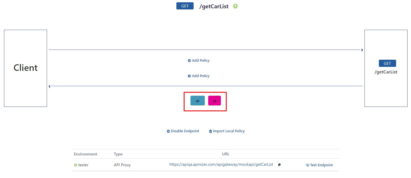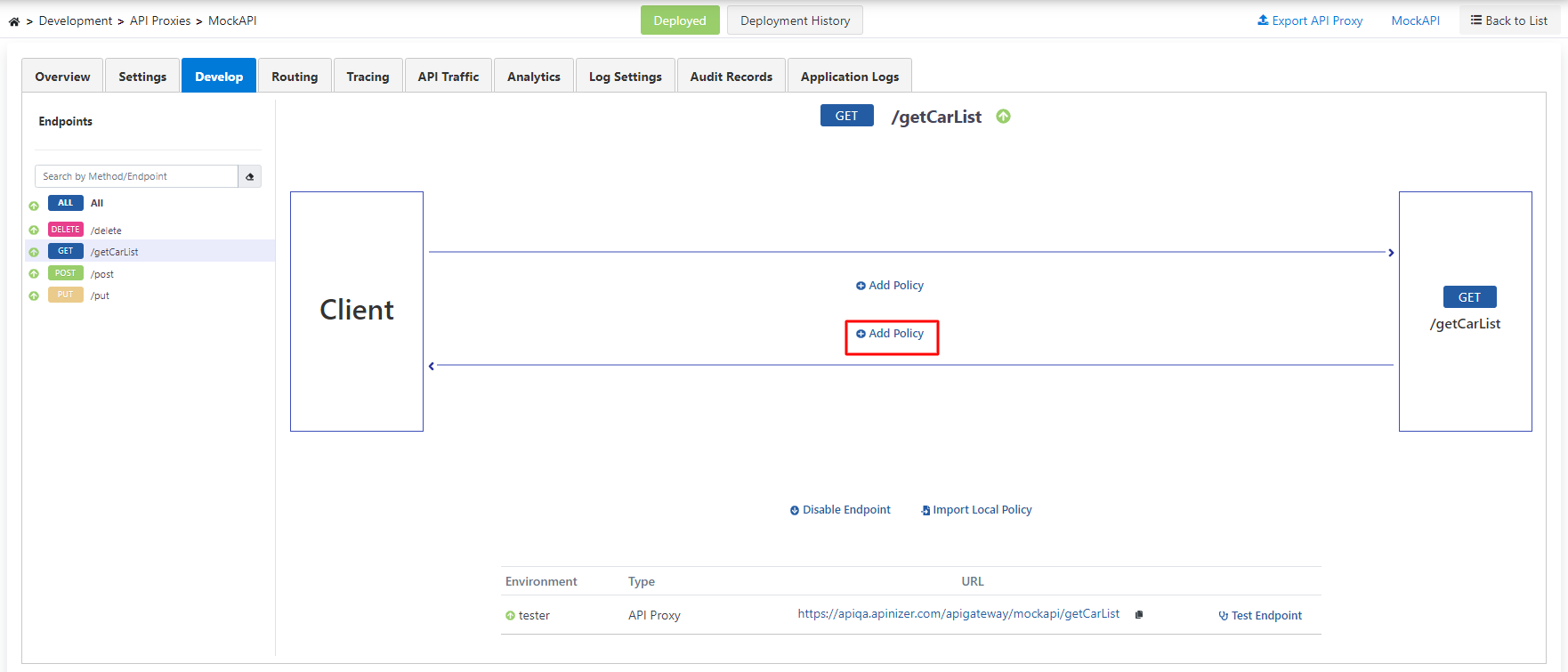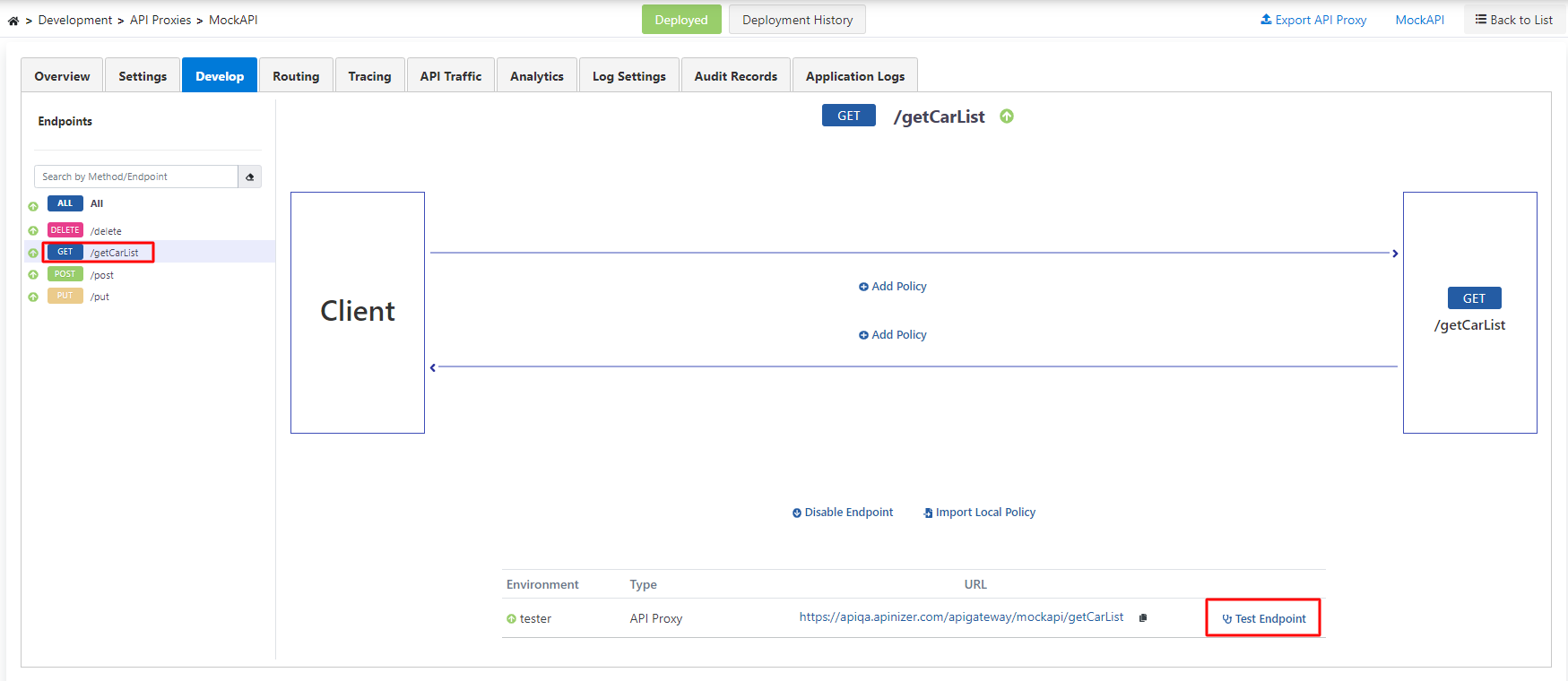 Develop menüsü altında yer alan /getCarList endpoint'i seçilir ve Test Endpoint butonuna tıklanır.