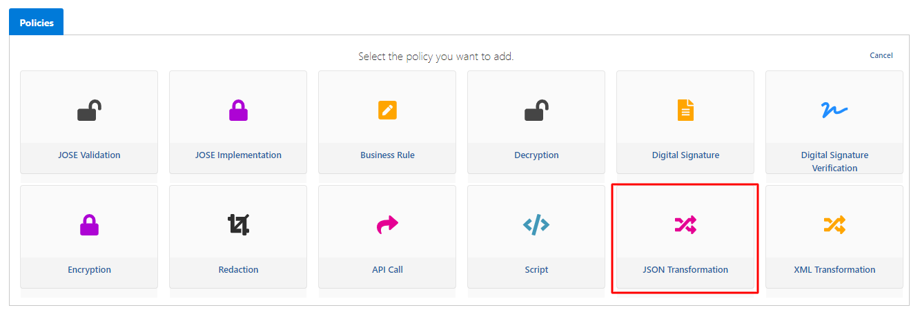 Açılan ekranda aşağıdaki görselde de işaretlenmiş olan JSON Transformation poliçesi seçilir.