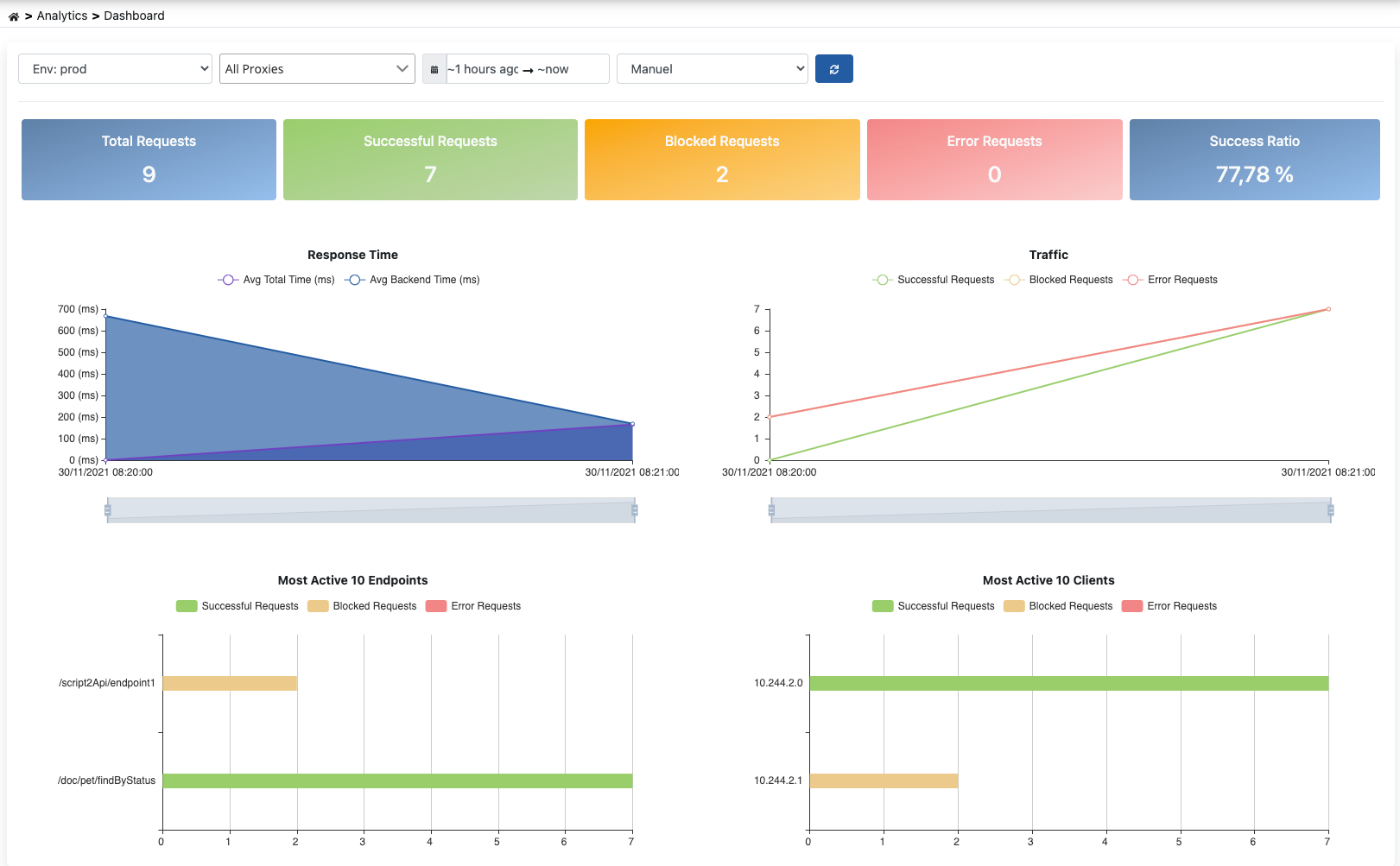 Analitik Panosu, proje içerisinde yer alan API Proxy'lerin log verilerinden oluşturulur. Pano, API Proxyler'in genel durumunu izlemeyi sağlar.
