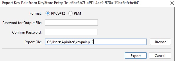 Keypair pkcs12 formatında .p12 uzantısı ile export edilir.