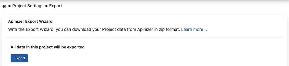 Apinizer, API Proje Dışa Aktarma Sihirbazı (Apinizer Project Export Wizard) ile Credential, Organization, Role varlıkları hariç projenin içerdiği tüm varlıkları zip formatında indirme imkanı verir.