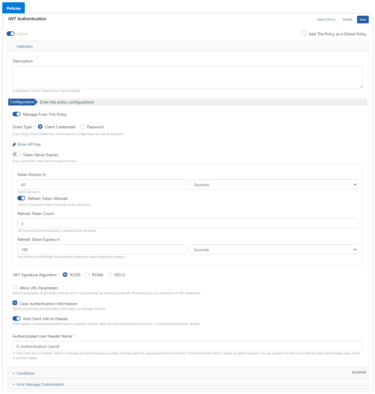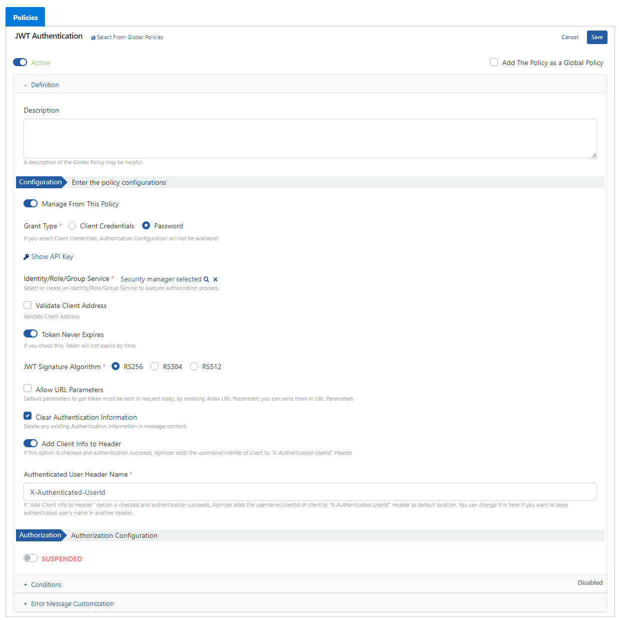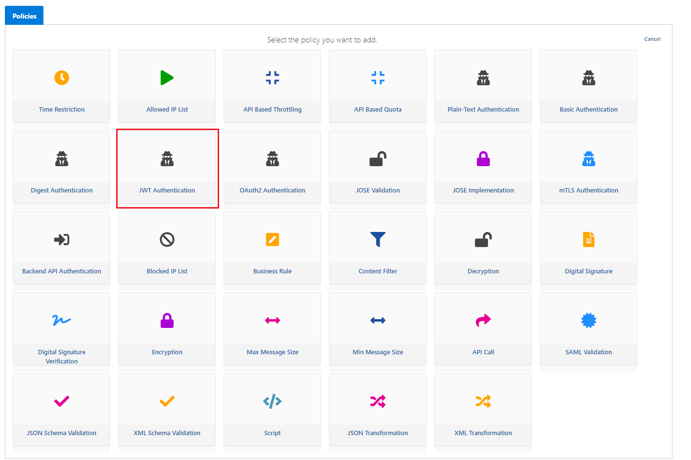 Açılan sayfada JWT Authentication poliçesi seçilir.