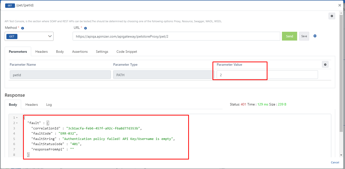 URL' de istenilen petId değeri 2 olarak girilir, Send butonuna basıldığında dönen yanıtın bir hata mesajı olduğu görülür.