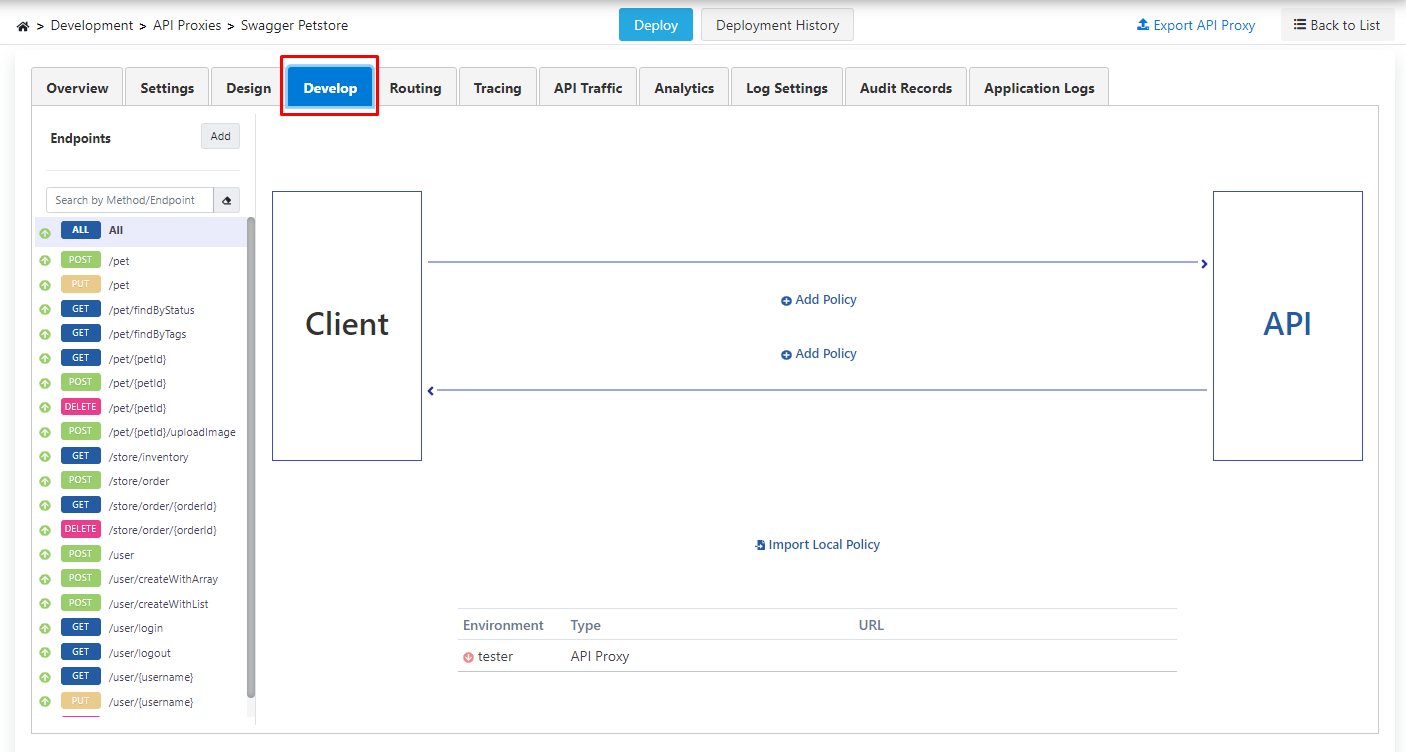 Daha sonra ise Develop sekmesine gelinir, Add Policy butonuna tıklanır.