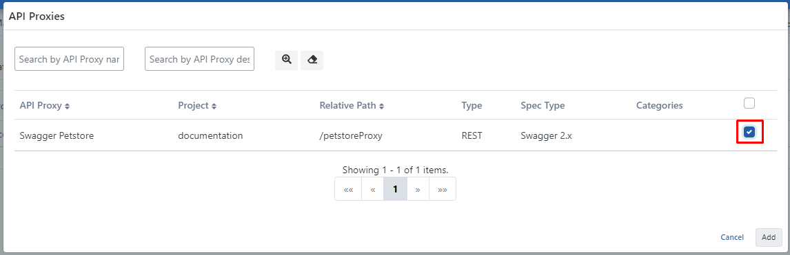 Açılan sayfada şu an üzerinde çalışılan projede bulunan API Proxy'ler listelenmektedir. Swagger Petstore isimli proxy seçilir.