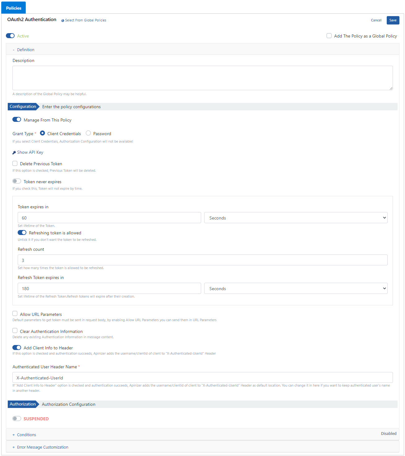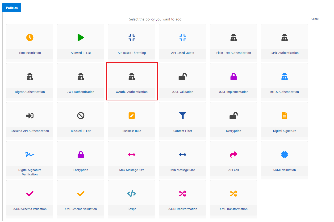 Açılan sayfada OAuth2 Authentication poliçesi seçilir.