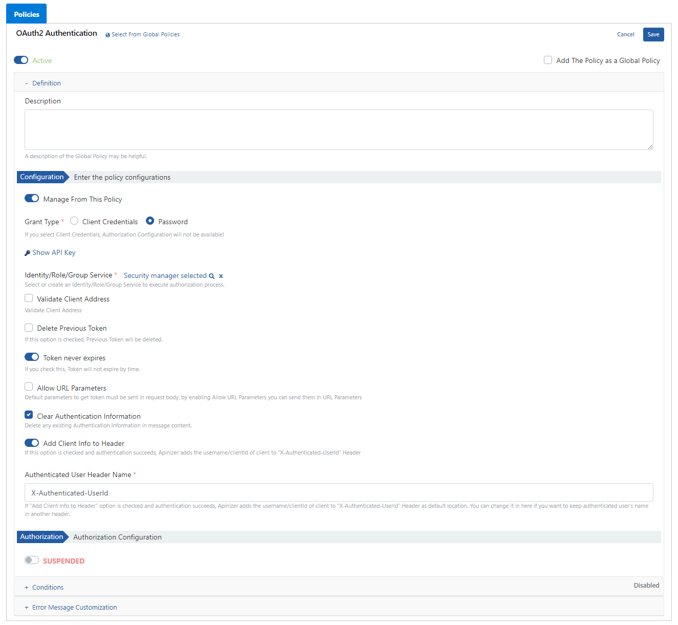 Artık OAuth2 Authentication poliçesi eklenebilir duruma gelmiştir.