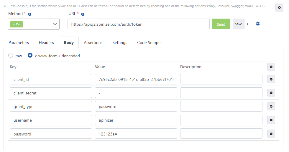 - Buraya token elde edebilmek için gerekli olan değerler yazılır ve Send butonuna tıklanır.