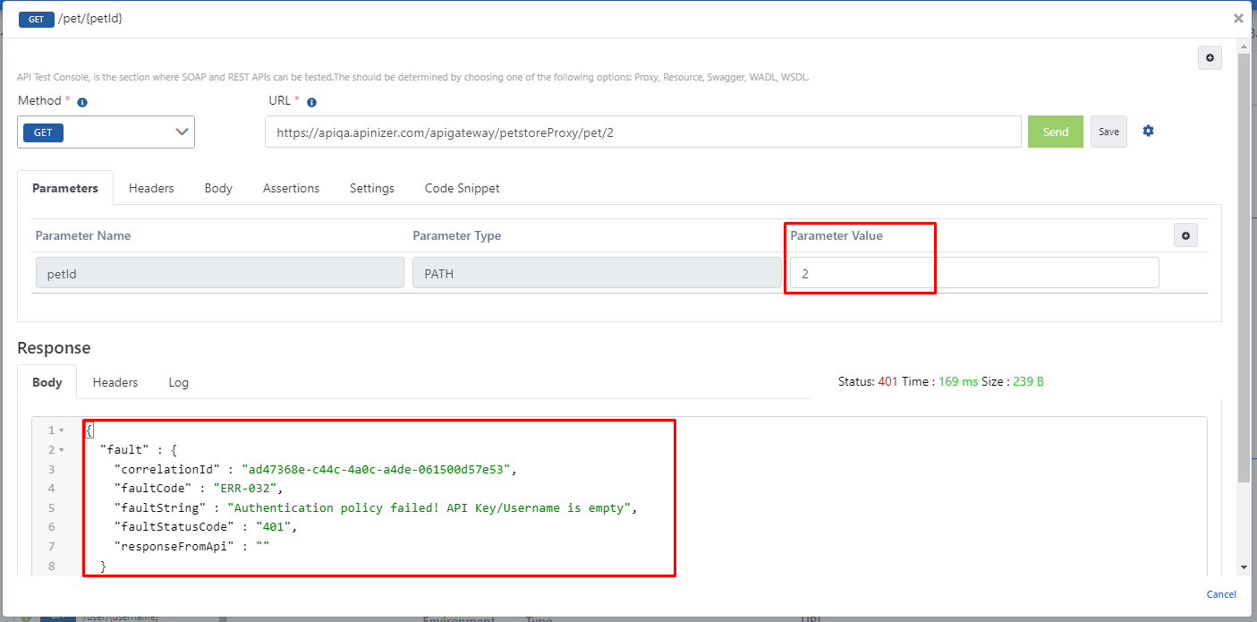 URL' de istenilen petId değeri 2 olarak girilir, Send butonuna basıldığında dönen yanıtın bir hata mesajı olduğu ve bu hatanın da uygulanmış olan OAuth2 Authentication ile alakalı olduğu görülmektedir.