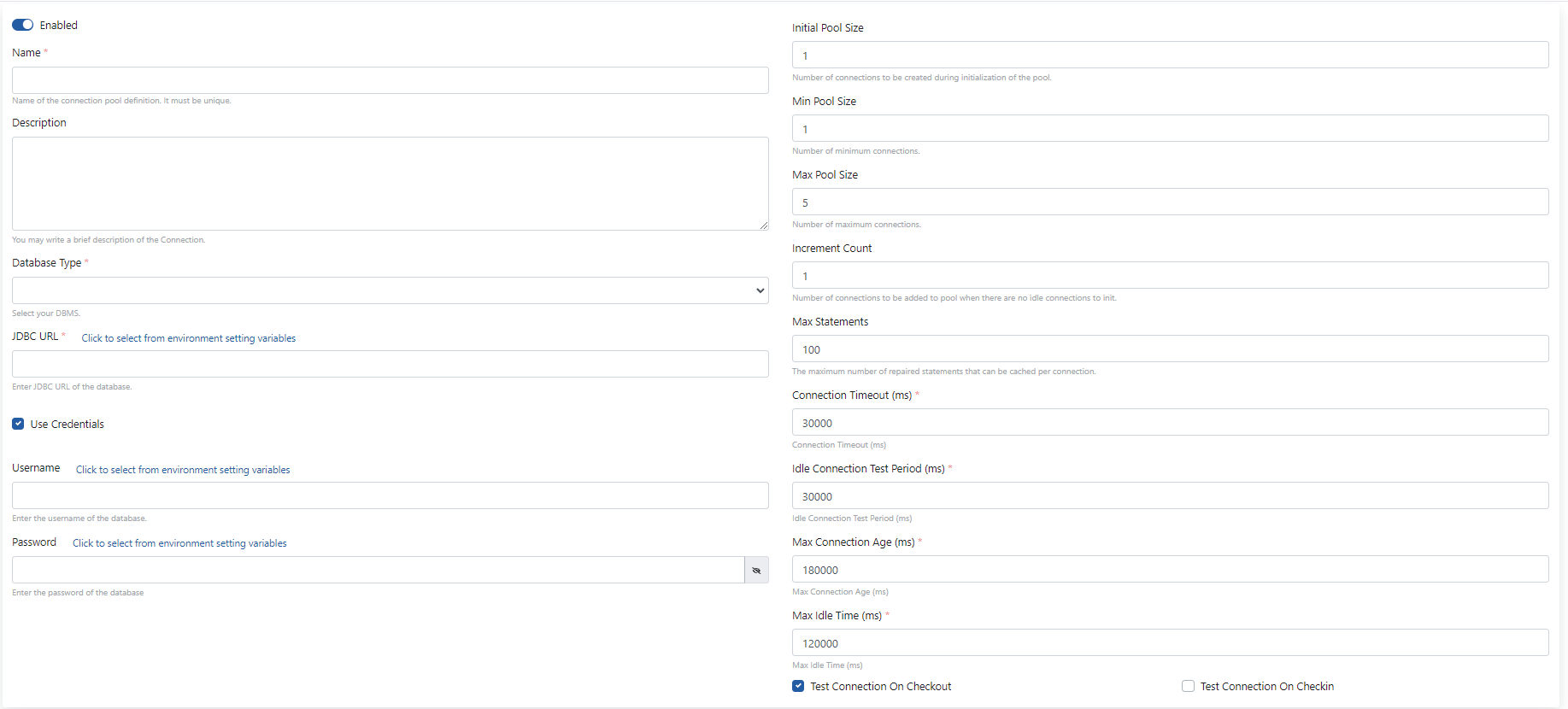 - JDBC URL alanı ile bağlanılacak olan veritabanına bağlanmak için gerekli olan JDBC adresi yazılır. Bu bilgi veritabanı ekibinden edinilebilir.