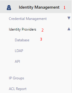 Aşağıda görüldüğü üzere Identitiy Management > Identity Providers > Database bölümünden daha önce oluşturulmuş veritabanı ile kimlik doğrulama tanımını eklemek üzere giriş yapılır.