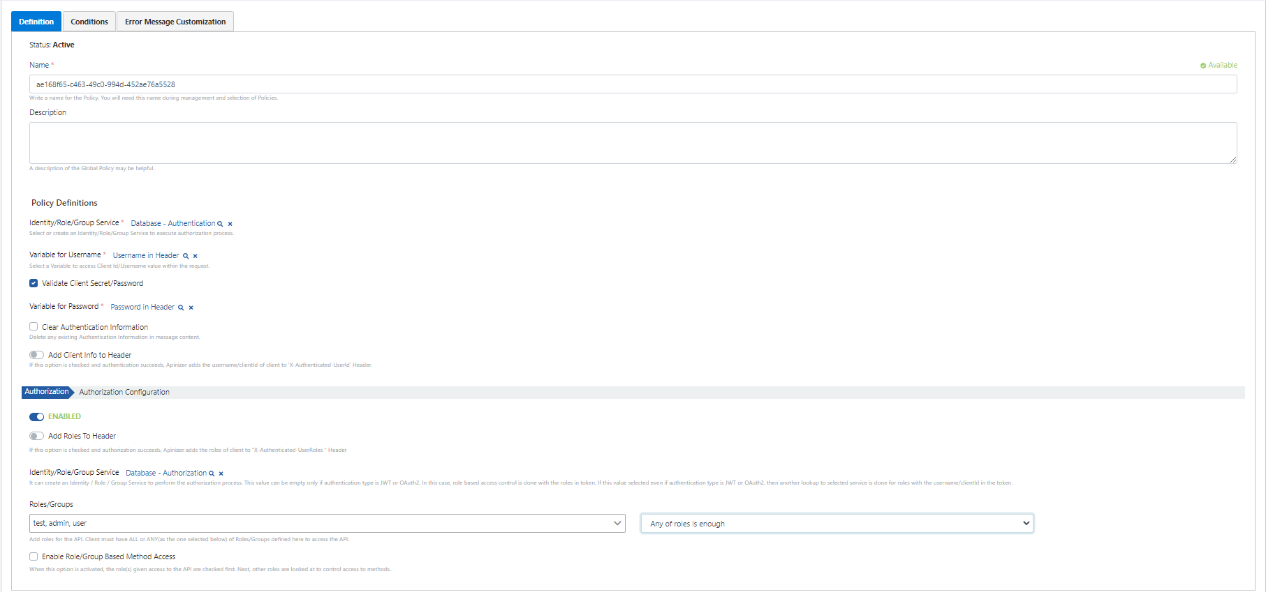 - Add Roles To Header seçeneği seçilirse yetkilendirme başarılı olduğu takdirde istemcinin rollerini “X-Authenticated-UserRoles” başlığına ekler.