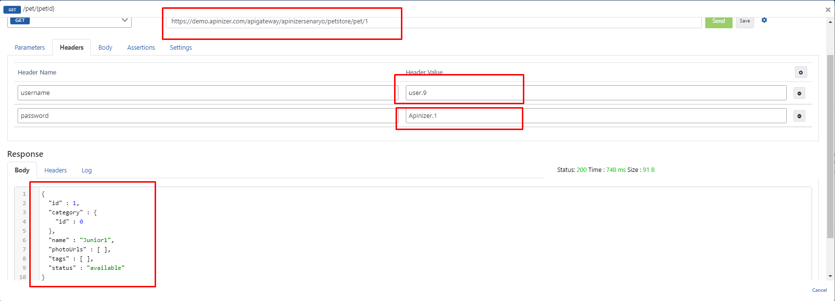 Backend API'ye gönderilecek olan headers içerisinde username = user.9 ve password = Apinizer.1 değerleri girilir.