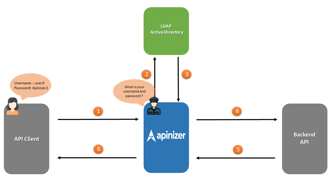 - LDAP'tan Apinizer'a authentication bilgileriyle ilgili cevap döner. Bu authentication doğru ise dört numaralı alana geçiş yapılır.