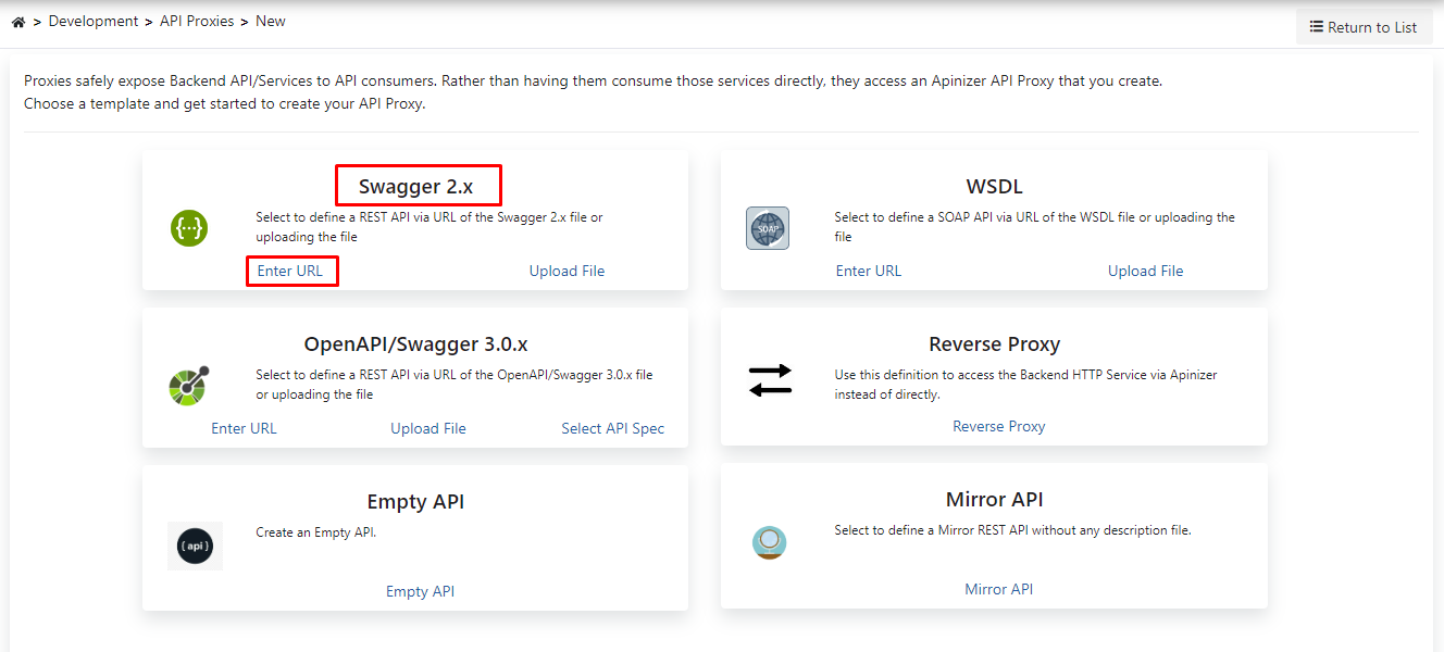 Bu senaryoda kullanılacak olan API'nin türü Swagger 2.X olacağı için bu tür seçilir.