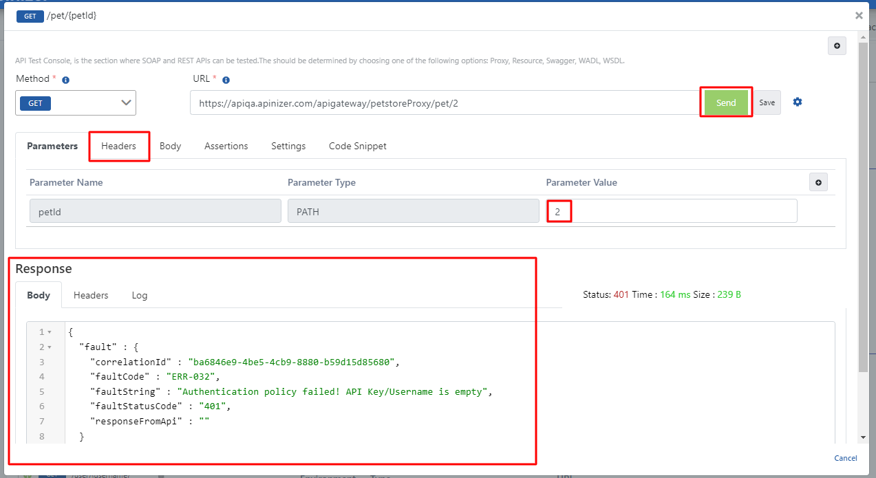 URL' de istenilen petId değeri 2 olarak girilir, Send butonuna basıldığında dönen yanıtın bir hata mesajı olduğu ve bu hatanın da uygulanmış olan Basic (Base64) Authentication ile alakalı olduğu görülmektedir.