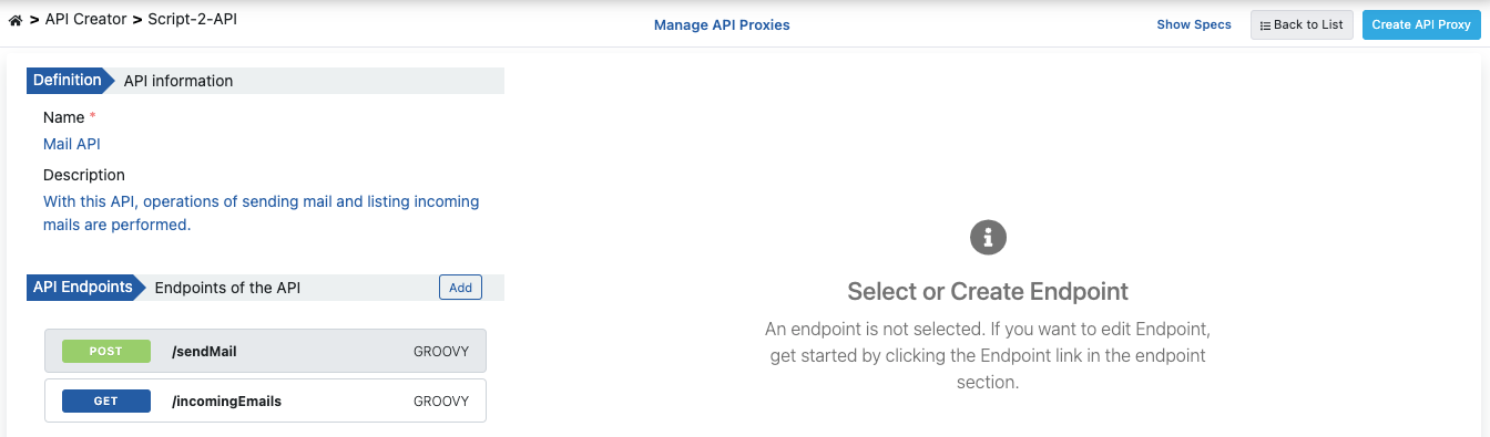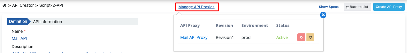 Bu işlem, aynı şekilde Script-2-API ekranında API Proxy'leri Yönet (Manage API Proxies) linkinden yönetilebilir.